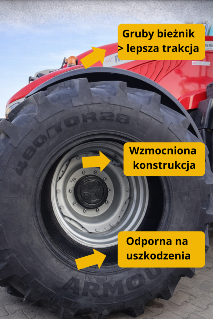 Opona przeznaczona jest do ciągników rolniczych pracujących w trudnych warunkach. Sprawdza się zarówno podczas prac polowych, jak i transportu.